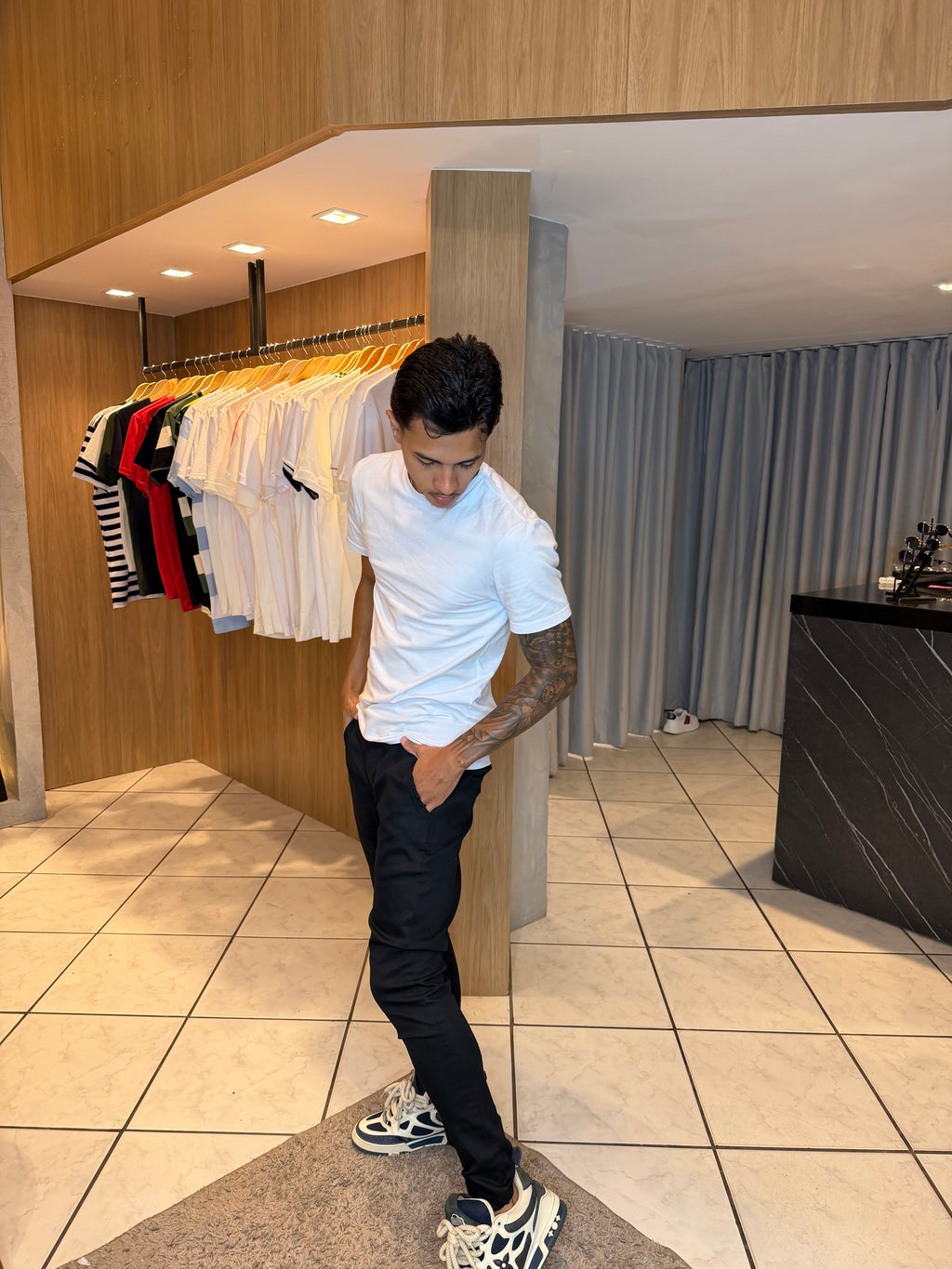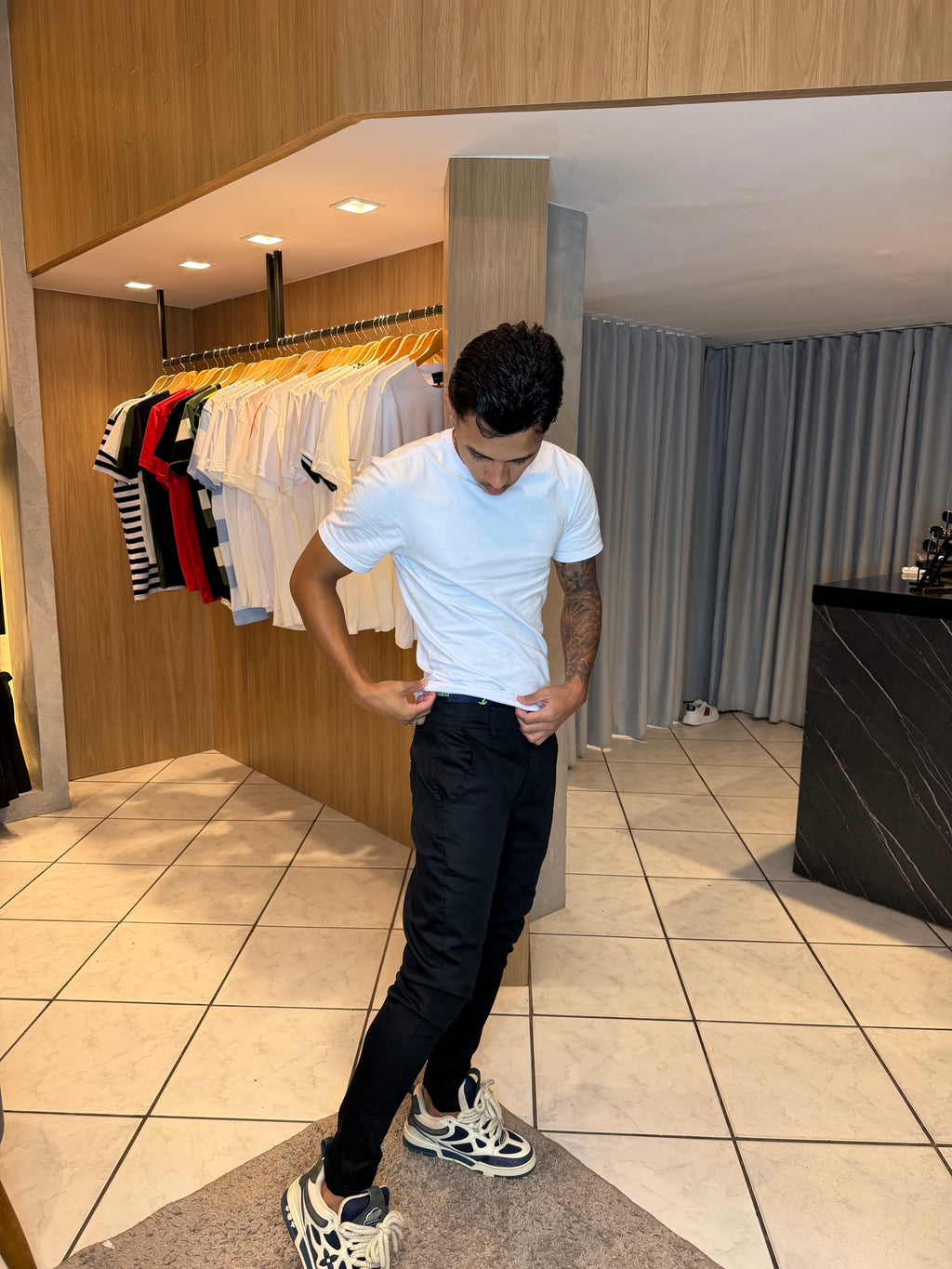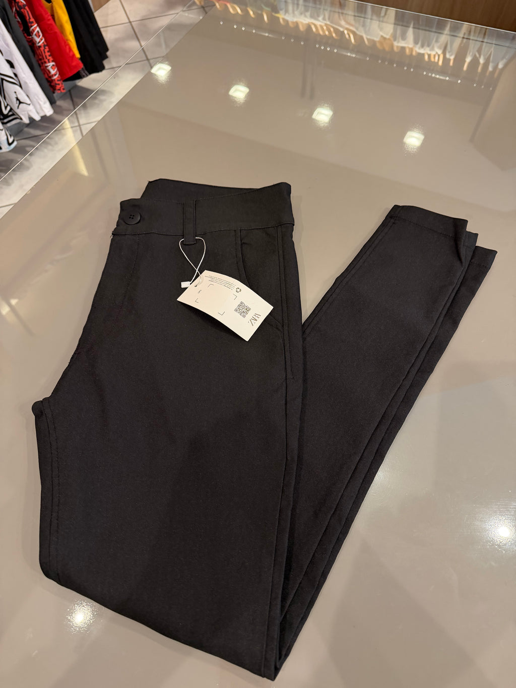 A calça skinny é confeccionada em um tecido de alta qualidade, geralmente uma mistura de algodão, elastano e outras fibras que proporcionam conforto e elasticidade. Ela abraça as pernas desde a cintura até os tornozelos, proporcionando um ajuste esguio e um visual esculpido. O cós é normalmente médio a alto, o que ajuda a alongar a aparência das pernas e a definir a cintura.